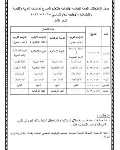 وزارة التربية تعلن جداول الامتحانات العامة للدراسة الابتدائية والمتوسطة للعام الدراسي (2025-2026) / الدور الاول، وسط امنيات النجاح للطلبة الممتحنين.