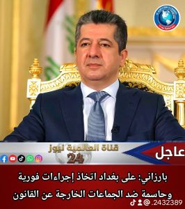 🔻بارزاني: على بغداد اتخاذ إجراءات فورية وحاسمة ضد الجماعات الخارجة عن القانون